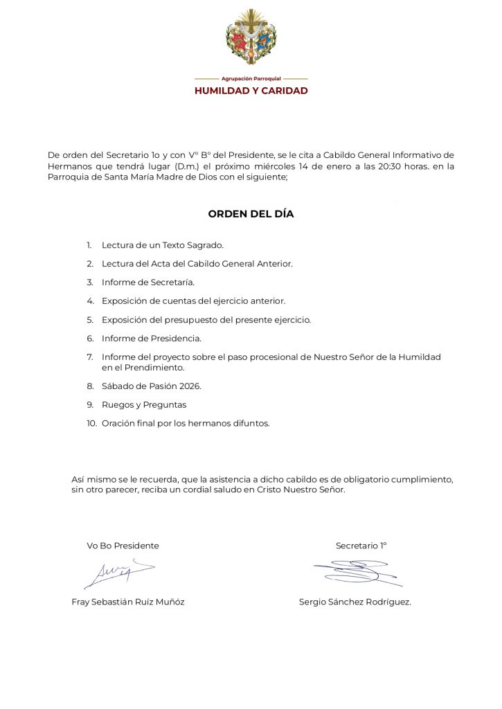 De orden del Secretario 1º y con V° B° del Presidente, se le cita a Cabildo General Informativo de Hermanos que tendrá lugar (D.m.) el próximo miércoles 14 de enero a las 20:30 horas, en la Parroquia de Santa María Madre de Dios con el siguiente